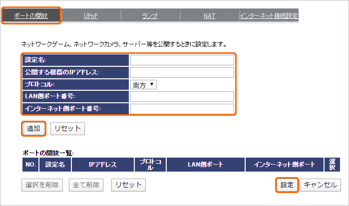 オンラインゲームやサーバーの公開をする場合は、特定のポートを開放します。
