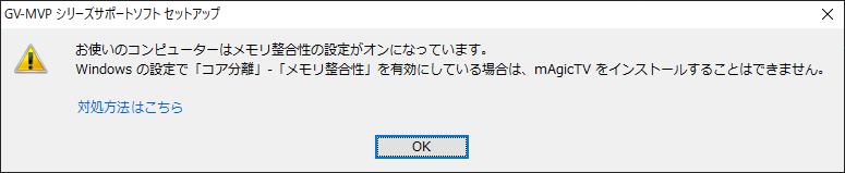 mAgicTVで「お使いのコンピューターはメモリ整合性の設定がオンになっています」というエラーが出るのですが?
