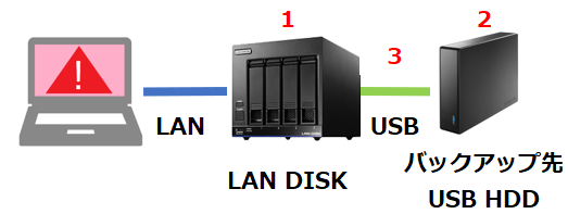 不正操作されたPCを利用し、LAN DISKのデータへアクセスされた場合、USB HDDのバックアップデータへもアクセスされてしまうリスクがあります。