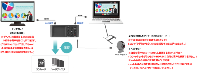 ・web会議上の様子を録画するためには、「GV-HDRECに接続する用のマイク(※録音する用)」「PCに接続する用のマイク(※web会議でオンライン上の相手と会話する用のマイク)」の計2つマイクが必要になります。