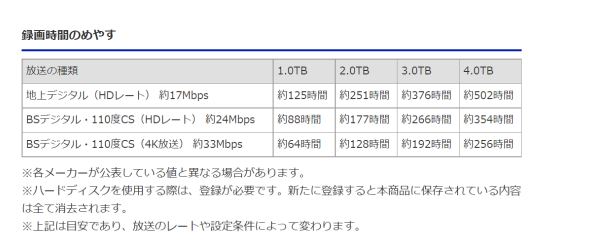 録画時間はお使いの家電によって異なりますが、目安時間は以下をご参照ください。