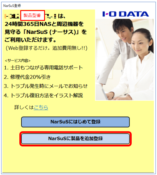 ①NAS管理画面を開く⇒「NarSuSに製品を追加登録」をクリック