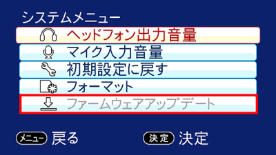 まず本製品はファームウェア更新の手順を実行しない限り、「ファームウェアアップデート」がグレーアウトして選択できないようになっています。(この表示の場合、ファームウェアバージョンの確認もできません。)