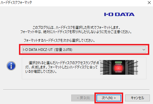 (1)フォーマットするHDDを選択して「次へ」をクリックします。