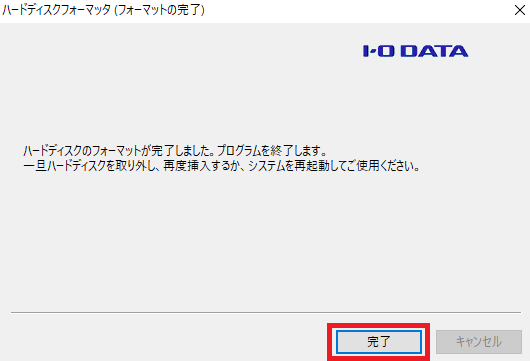 (5)「完了」をクリックし、取り外し処理をした上でUSB HDDを取り外してください。