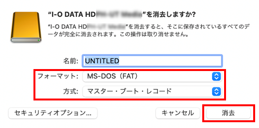 ②「フォーマット」に「MS-DOS(FAT)」を指定します。