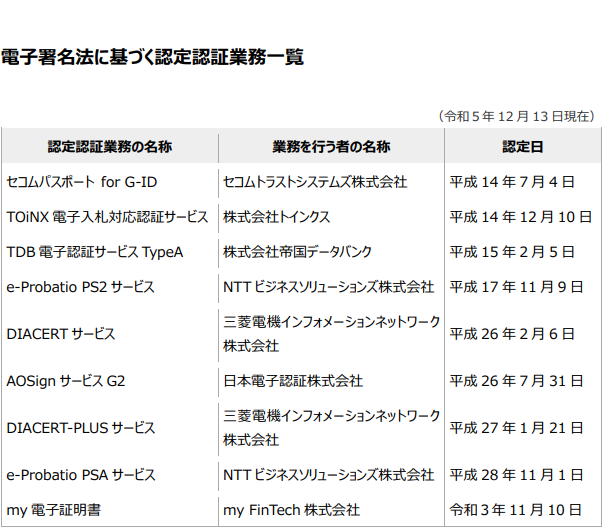 入手先の参考として、デジタル庁に「電子署名法に基づく認定認証業務一覧」の案内があります。