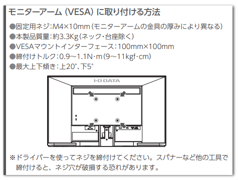 各製品に同梱されております『取扱説明書』記載の<モニターアーム(VESA)に取り付ける方法>の固定用ネジの長さにご注意下さい。