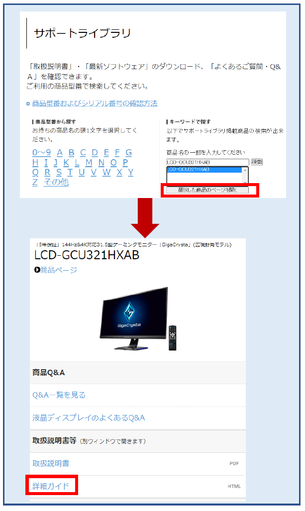 1.こちらから商品の型番を検索し、[選択した商品のページを開く]をクリックします。
