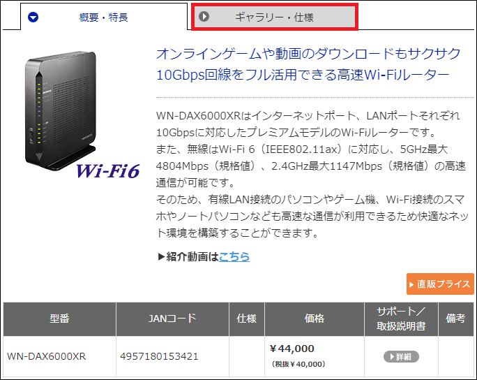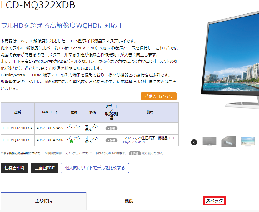 ▼モニター・ディスプレイ専用ページの場合…【スペック】を選択
