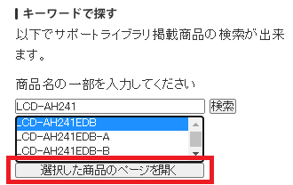 該当する型番を選択し、「選択した商品のページを開く」をクリックします。
