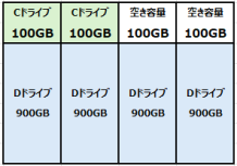 各HDDに約100GB分のCドライブ領域/空き領域があります。