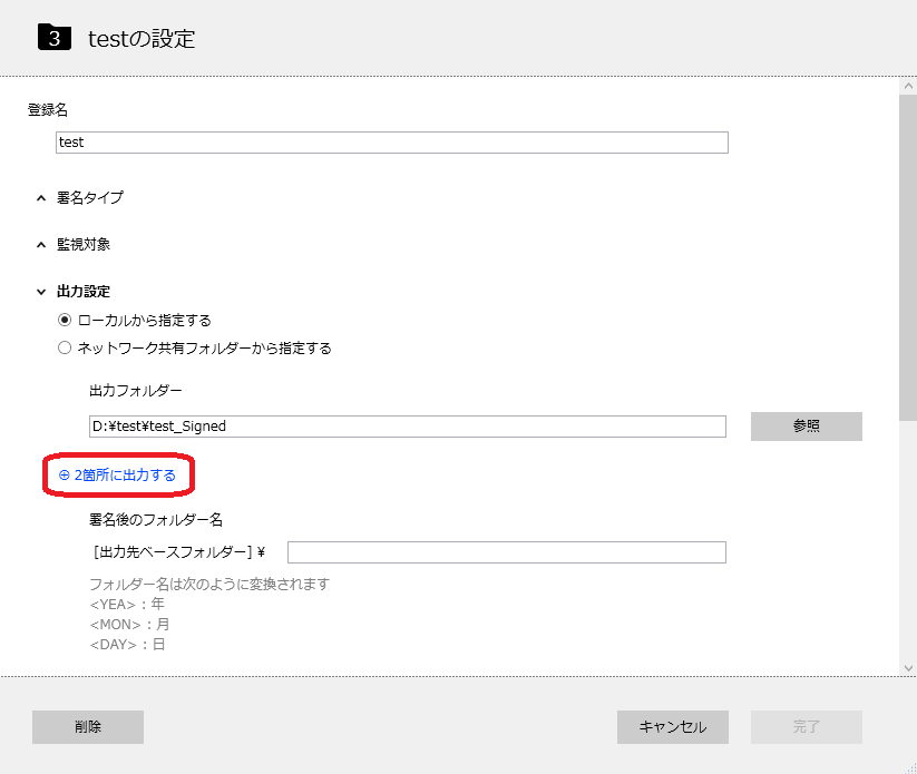 1.LTV-Sign上の[署名フォルダーを追加する]より、一旦出力先が1箇所の設定を追加する