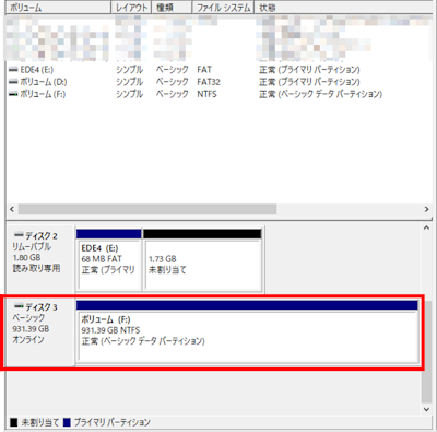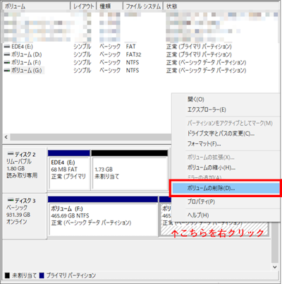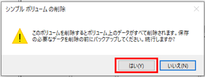 こちらの手順で[ボリュームの削除]⇒[はい]をクリックすると保存されていたデータは全て消去されてしまいます。