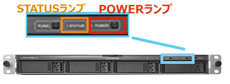 | 赤点滅 | 何らかの警告があります。 設定画面ログイン後、左上の「通知」、または[情報・ログ表示]→[お知らせ]または[システムログ]をご確認ください。 ⇒起動できない場合は、内蔵ディスクの以上かシステム以上が発生しています。修理センターに送付してください。 【参考Q&A】:設定画面を開きたい ■UPS警告が有効時 ■暗号化している場合 |