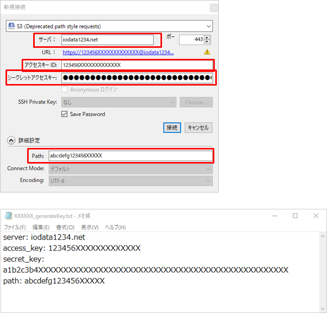 | 新規接続画面の項目 | 「外部アプリ用キー」のファイルの該当箇所 |