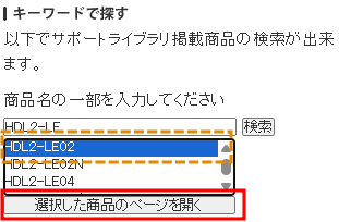 ⇒検索候補に該当の型番名が表示されたら、型番名をクリックして「選択した商品のページを開く」をクリックします。