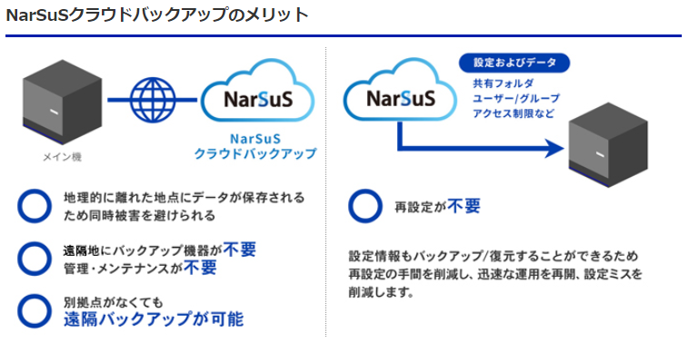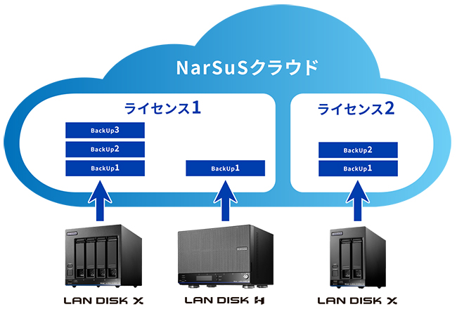NarSuSクラウドバックアップはランディスク遠隔管理サービス「NarSuS(ナーサス)」のオプションサービスです。ご利用ライセンス(有償)を登録することで、ご使用中のNASの設定および業務のデータをクラウドにバックアップできるサービスとなります。