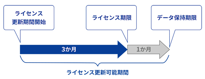 ライセンスは期間終了の3か月前から更新が可能になります。ライセンス終了後も、1か月間はライセンスの更新ができますが、その間はライセンスを更新するまではバックアップや復元などバックアップデータへのアクセスはできなくなります。また、1か月経過後、クラウドデータは自動的に削除されます。削除されたデータはいかなる理由でも元に戻すことはできません。ご了承ください。