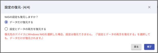 復元する際に、「データだけを復元する」「設定とデータ両方を復元する」のどちらかを選択して復元できます。