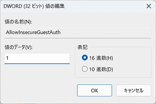 ③[AllowInsecureGuestAuth]をダブルクリック後、[データの値]を1に変更します。