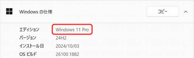 - [Windowsの仕様]の[エディション]欄を確認します。確認した結果に応じて、下記の内容を確認します。