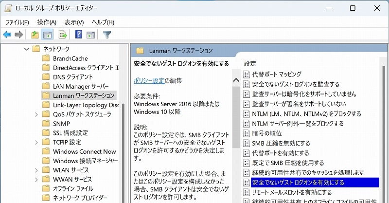 ウィンドウ右側の[安全ではないゲストログオンを有効にする]をダブルクリックします。