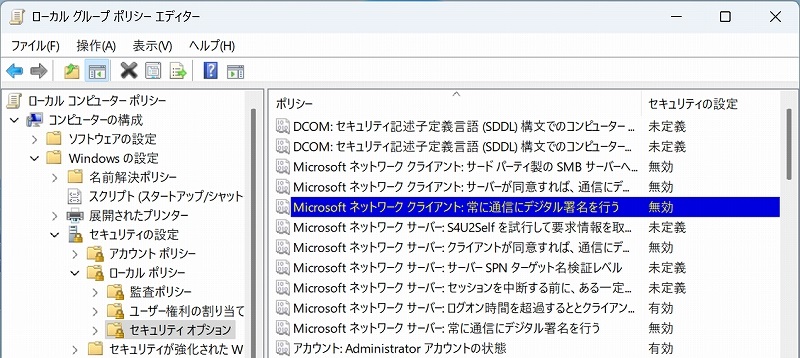 - ウィンドウ右側の[Microsoft ネットワーク クライアント: 常に通信にデジタル署名を行う]をダブルクリックします。