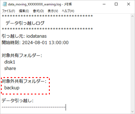 引っ越しできなかったフォルダーやファイルを、ログファイルよりご確認ください。