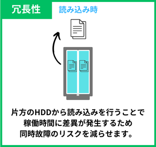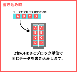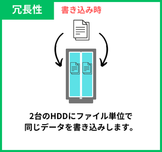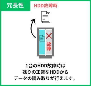 1台のHDDが故障しても、もう片方のHDDからデータを読み出すことが可能です。