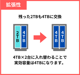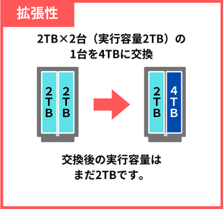 2台のHDDにデータを複製するため、使用できる容量はHDD1台分(半分)になります。