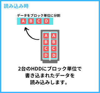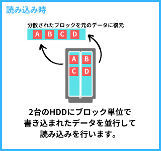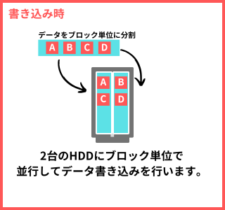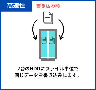 2台のHDDに対して並行して読み書きするため、高速アクセスが可能です。