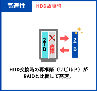 HDD交換時は、常にHDD全体を再構築するRAIDとは異なり、拡張ボリュームは使用されたデータ領域のみを再構築するため、所要時間が短くなります。