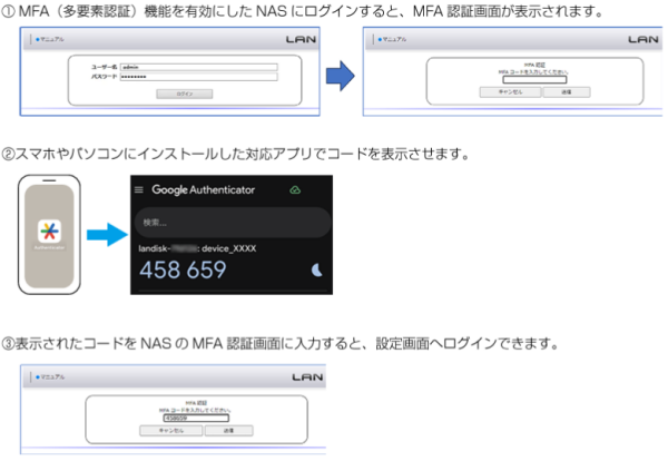 一部のLAN DISKでは、設定画面ログイン時に多要素認証(MFA認証、二段階認証)の設定が可能です。対応LAN DISKはこちらをご確認ください。