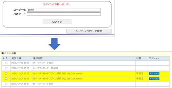 ログインに失敗した内容が、システムログおよびNarSuSにて「不正ログイン」として通知されます。
