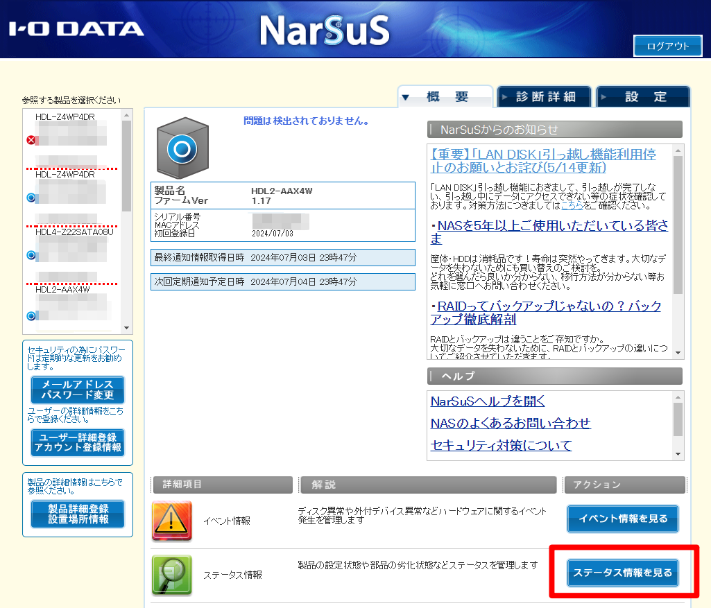 ご利用の機器をNarSuSに登録している場合、NarSuS画面からも確認ができます。