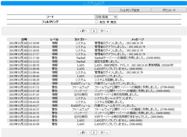 設定画面の「システムログ」より、HDDの状態を確認することができます。