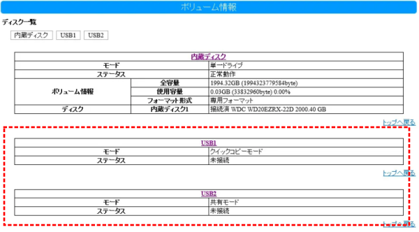 USBHDDのモードが「ミラーリング」、または「拡張ボリューム」になっている場合、USBHDDの接続が外れている、または故障していると「構成異常」となります。