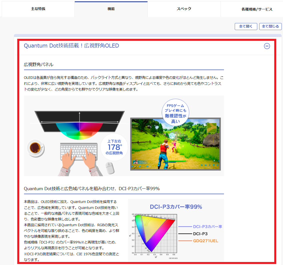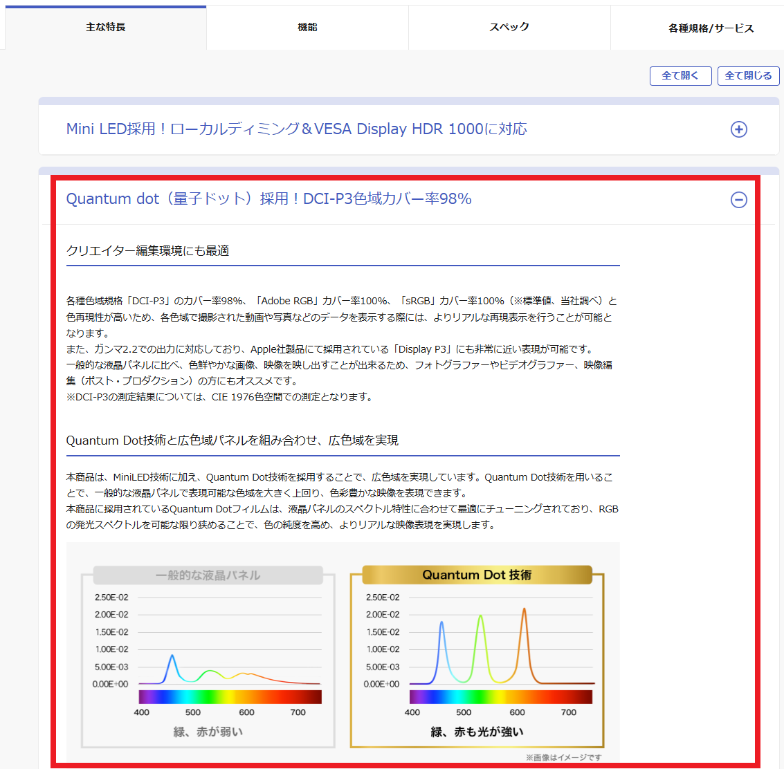 sRGBカバー率・DCI-P3カバー率は、広色域モデルのみ、値を公開しています。 商品ページに記載がないものについては非公開となりますので予めご了承ください。