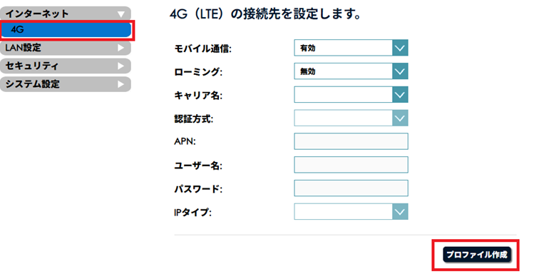 本製品には予めいくつかのSIM接続設定情報(APN設定)がセットされており設定画面から選択することでインターネット接続設定が行えます。