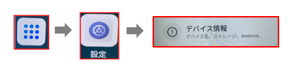 ①ホーム画面のサイドバーから「アプリ一覧」→「設定アイコン」→「デバイス情報」をタップ