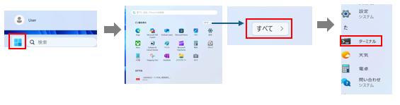 ②Windows画面で、タスクバーの「Windowsキー」→「すべて」→「ターミナル」をタップ