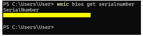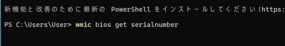 wmic bios get serialnumber 入力後に、「Enter」キー押下します。