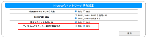 LAN DISKの設定画面より「共有サービス」-「Microsoft ネットワーク共有設定」を開き、「ディスクへのフラッシュ要求を無視する」項目にて「有効」にチェックを入れ適用してください。