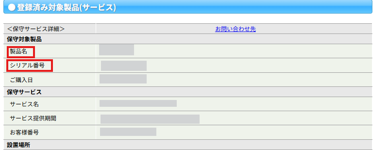 マイページにログイン後、以下画面にて保守対象製品の、型番・シリアル番号をご確認ください。
