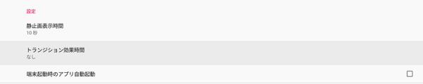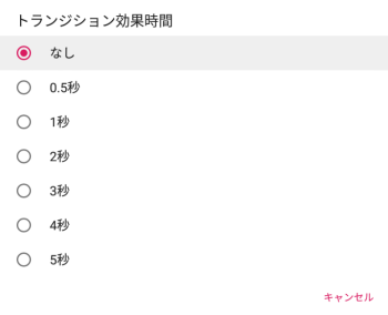 | トランジション効果時間 | コンテンツが切り替わる際のフェードイン/フェードアウトの時間を設定します。なし、0.5~5秒から選択してください。(初期値:なし)![]() |