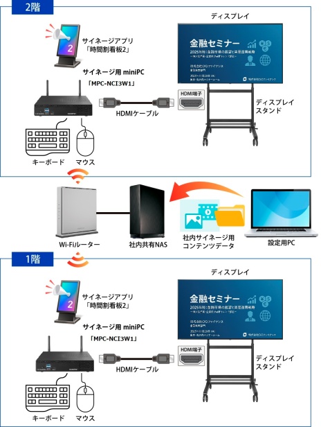 本サイネージは、時間割看板2サイネージセット(※)とNASを使用したご案内となります。