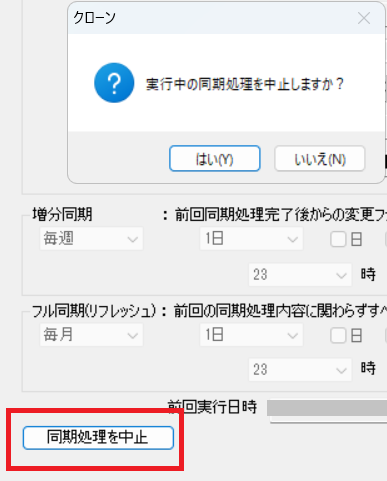 クローン for Windowsにてジョブが動作中はアプリ画面左下のボタン表示が「同期処理を中止」に変化しますのでこちらを押して同期を止めることが可能です。