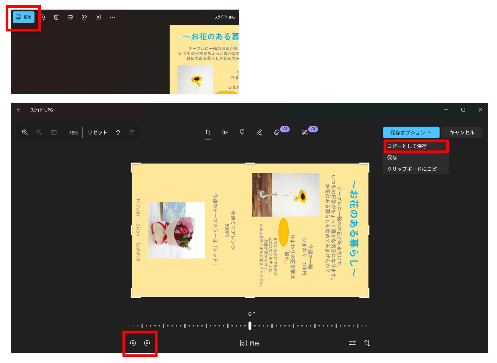 Windowsで画像を開き、編集モードにし回転させてから保存をしてください。