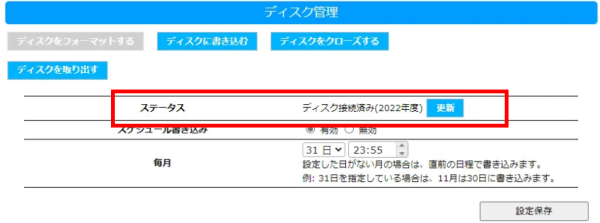 LAN DISKの設定画面へアクセスし、「命名くん連携」-「ディスクの管理」を開く、ステータス項目を確認してください。